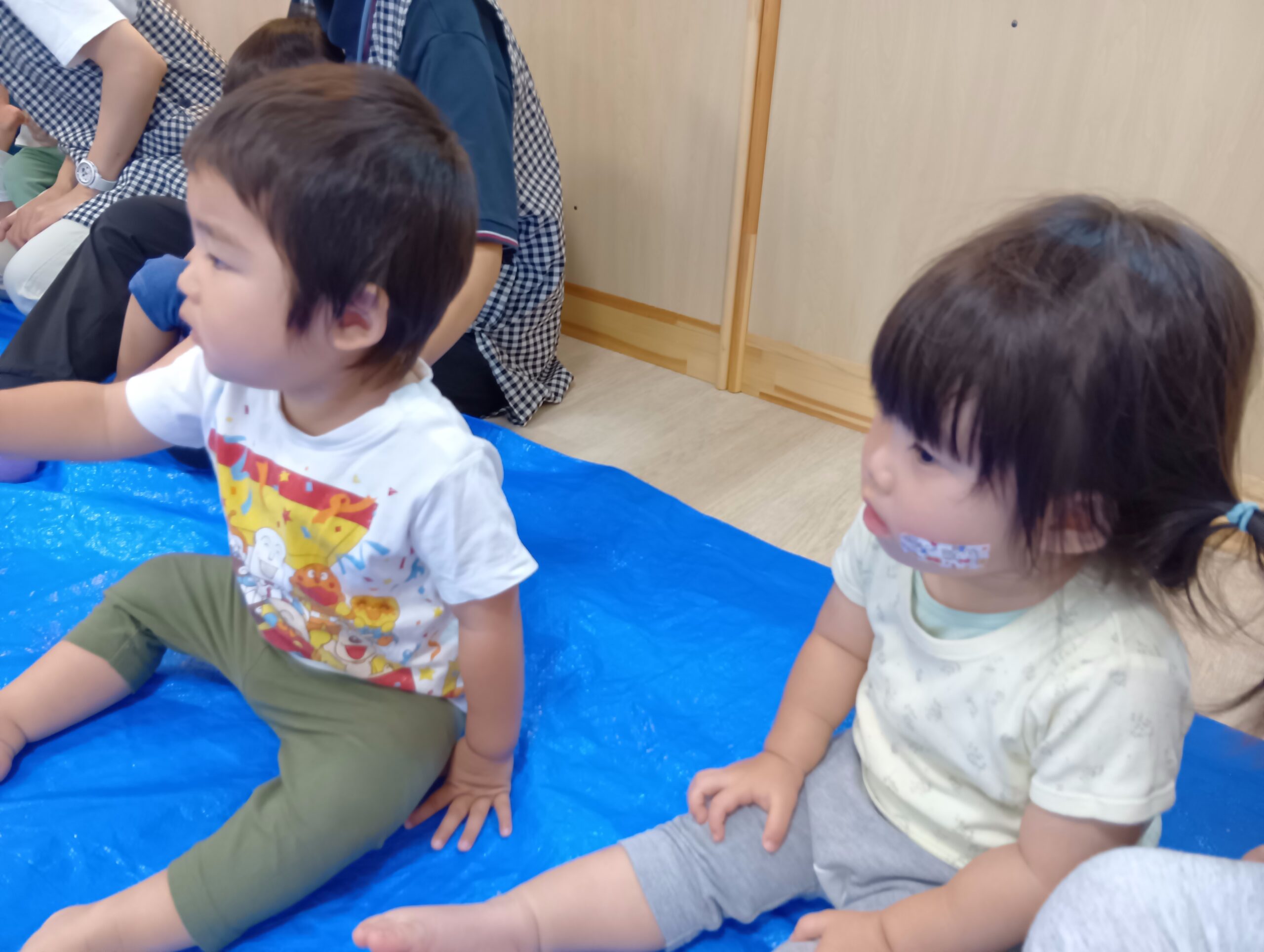 シートの上に座ると¨なにがはじまるのかな?¨とそわそわする子どもたち♪