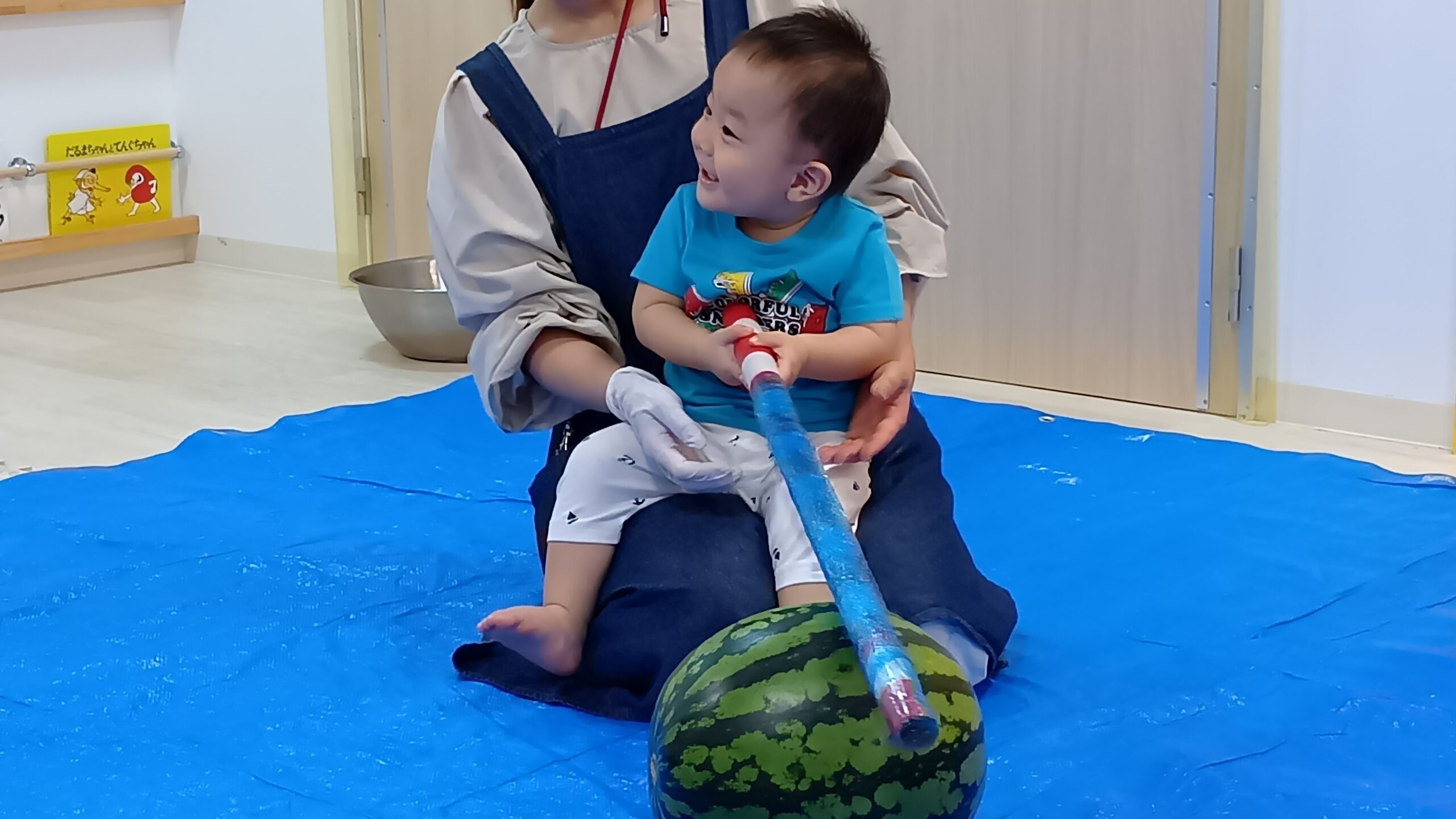 スイカを観察しているうちに、隣のお部屋にブルーシートを敷いてスイカ割りの準備が整いました!
