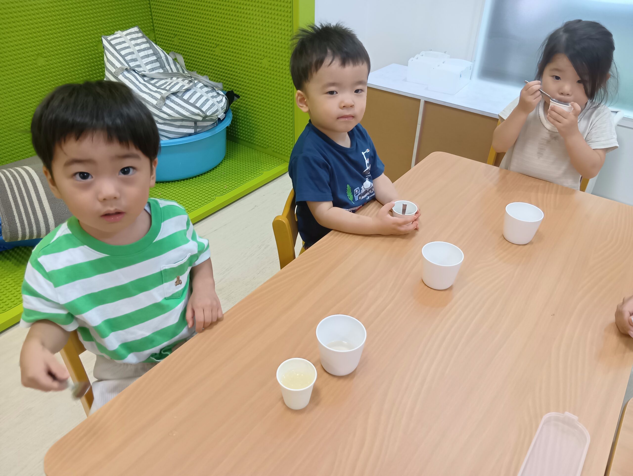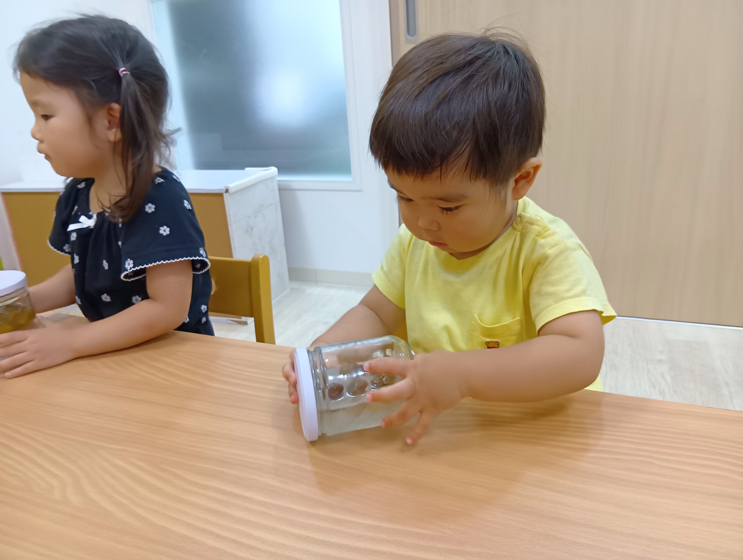 2歳児クラスのお友達は、「このまえといろがちがうね!」「こいいろになってる」と1カ月経った後でも前回のことよく覚えていて保育士やお友達に感想を伝え合っていました。そんな姿を0歳児、1歳児クラスのお友達が見ていて、「そうなのかな?」と言った様子で見ていたのが可愛かったです。