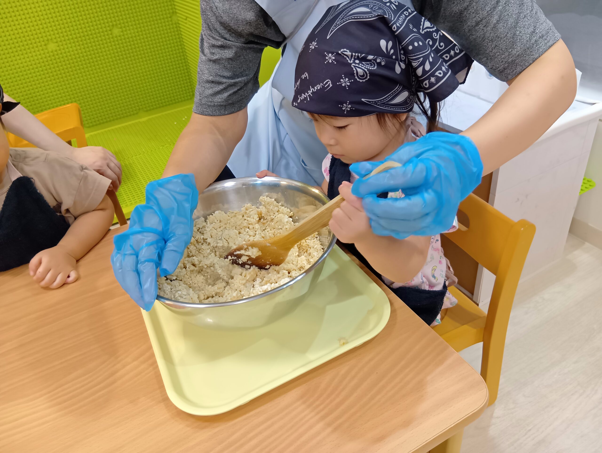 大豆を潰し、塩や麹と混ぜる下ごしらえから取り掛かり、毎回保育園で行う食育活動の日に出してきて変化を観察しました。